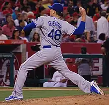 On November 2, Guerra underwent arthroscopic right shoulder surgery, his third different surgery in 2012.[4] He returned in time for spring training, but his injury kept him from participating in the 2013 World Baseball Classic.[5][6] He also suffered a groin strain during spring training and the setback led to him falling behind the other relievers and he was optioned to Albuquerque to start the season.[7] He spent the bulk of the season there, appearing in 27 games (including 4 as a starter) and was 0-4 with a 3.66 ERA and 12 saves. He also appeared in 9 games with the Dodgers in May and had an ERA of 6.75.[8]