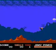 Items encountered include crabs (increases movement speed of the diver), stars (bonus points), and conch shells which are used as currency in this game. Equipment and upgrades are purchased by alternating between two ports on the map. The first port visit gives the player a receiver, which tracks the location of Jaws relative to the boat on the overhead map; the faster it beeps, the closer Jaws is to the player. Future visits to ports afterwards increase overall attack power against Jaws. Touching a hostile sea creature during the side-view undersea encounters will kill players and penalize them with a power level drop by one (if they had upgraded their attack power), the loss of the tracking device, the loss of half of the conch shells accumulated to that point, and complete health replenishment for Jaws.