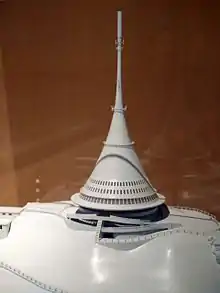 After the existing Ještěd lodge burned down in January 1963, a decision was made by Restaurace Liberec (the company that used to manage the burned-down lodges) and the Prague Radio Communications Administration to build a new complex on the summit of Mount Ještěd, which would accommodate a mountain hotel including a restaurant and at the same time would serve as a TV signal transmitter. An architectural competition for the building design was announced. It took place in February 1963 on the Liberec Stavoprojekt premises.[4] Eleven architects/teams took part in the competition, including individual architects Otakar Binar, Jiří Svoboda, Pavel Švancer, Ota Nykodým, Karel Hubáček, Jaromír Syrovátko, Miroslav Ulmann, Jaromír Vacek and teams Josef Patrný - Jiří Hubka - V. Netolička, Miloš Technik and Svatopluk Technik.[5] Hubáček's design was the only one complying with both the requirements.[5] All the designs were put on public display in the Liberec branch of Československá spořitelna. The jury (aka the council of Liberec district national committee) on its April 22, 1963 meeting chose Hubáček's proposal as the winner.[5]
