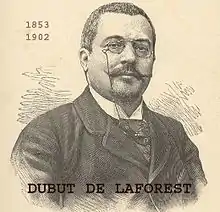 Dubut de Laforest was a member of Le Chat Noir and of the theatrical and artistic circle Gardénia, founded by Paul Fabre.[1] He published a number of novels that were based on the scientific discoveries of his time, and also novels of manners: Les Dames de Lameth, Tête à l'envers, La Crucifiée, Le Rêve d'un viveur, Un américain de Paris, Belle-maman, La Baronne Emma, Contes à la paresseuse, Les Dévorants de Paris, Le Gaga, La Bonne à tout-faire, Le Cornac, Mademoiselle de Marbeuf and Contes à la lune.