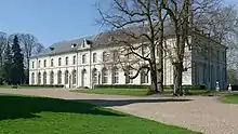 Jean Aubert frequented the unofficial Académie du Petit-Luxembourg, in the Hôtel du Petit Luxembourg, that was founded in 1729 by the comte-abbé de Clermont, another member of the house of Condé, the younger brother of the builder of the stables of Chantilly. For the abbé, who was abbé commendataire of Chaalis, Aubert created the plans for the reconstruction of Chaalis Abbey in 1736. Begun in 1739 and intended as a large quadrangle, only the entrance wing with the abbot's residence was completed. Further work was halted in 1745 due to lack of funds and never resumed.[7]