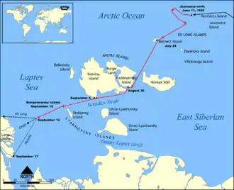 De Long steered the boats through the channel between Novaya Sibir and Kotelny Island,[117] before skirting the southern coast of Kotelny and beginning the final stage of the journey, across the open sea to the Lena Delta.[118] Their last halt on September 10 was on the tiny Semyonovsky Island, fewer than 100 nautical miles (190 km; 120 mi) from the Siberian coast.[119][120]