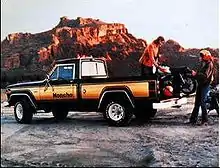 From 1976-1983 the "Honcho" trim package was offered on the J10 pickup. It consisted of bold striping and decals, and was offered with factory extras such as the Levi's interior or a roll bar. The content of the Honcho package varied from year to year, but "always included the wide-track look of the Cherokee Chief."[13]