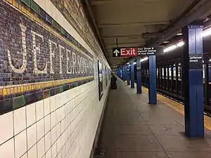 The station's name tablets read "JEFFERSON ST." in gold serif lettering on a blue/dark red background, yellow inner border, and green outer border.[20] There are also directional signs in gold serif lettering on blue/dark red background and yellow/green border.[20] Blue i-beam columns run along both platforms at regular intervals with alternating ones having the standard black station name plate in white lettering.[20] New tile was installed at the Canarsie-bound platform in the summer of 2000.[20]