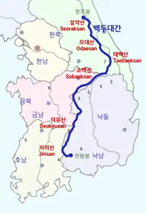 According to several texts of the Jeonggamnok, the sipseungji 十勝地 are ten places where you can live in peace and take refuge from hunger and war. Here the names of nowadays are from the Chosun Ilbo, and the comments from the Nam Sago Secret as translated by Jorgensen.[33] The blue line is 백두대간, Baekdu-daegan, the largest and longest mountain range on the Korean Peninsula from Mt. Baekdu to Mt. Jirisan.