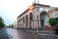 The town of Jerez is fifty seven km from the state capital of Zacatecas, located in a deep valley surrounded by forests and fruit orchards.[1] The architecture and layout are distinct from the state capital. The town is centered on a main square called Jardín Rafel Páez, which was the site of the old traditional market. It is surrounded by a wrought iron fence and in the center there is a Moorish style kiosk made of metal with a sandstone base. It is a popular place on Sundays for men playing dominoes and for bands playing a local music called tamborazo, a type of band music with a distinctive rhythm. On the south side of the square is the Portal Humboldt, which has two different types of arches, one in Romance style and the other in Arabic. To the north is the Portal Inguanzo, which dates from 1797. It is the exterior of what was a private home. Today the building houses a café-ice cream shop.[2][1]