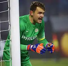 In the 2016–17 season, Zoet started the season well when he helped the side beat Feyenoord 1–0 to win the Johan Cruyff Shield.[73] He then got off with a winning start for the side by keeping four clean sheets between 20 August 2016 and 10 September 2016.[74] On 10 September 2016, Zoet made his 100th league appearance for PSV Eindhoven against N.E.C., in a 4–0 win, earning his fourth clean sheets.[75] He then started every match until he suffered a muscular problem that saw him out for a month.[76] It wasn't until on 19 November 2016 when Zoet returned to the starting lineup from injury, in a 0–0 draw against Willem II, earning his fifth clean sheet of the season.[77] In a follow up match against Atlético Madrid in the UEFA Champions League Group Stage on 23 November 2016, Zoet captained the side for the first time this season, in a 2–0 loss.[78] He then kept two clean sheets in two matches between 3 December 2016 and 10 December 2016.[79] By the end of 2016, Zoet conceded seven goals in the last fourteen matches.[80] Throughout the 2016–17 season, Zoet expressed his optimism that the club would win the league for the third time in a row.[81] He was at fault during a match against Feyenoord on 26 February 2017, conceding an own goal, which turned out to be a winning for the opposition team, as they won 2–1.[82] Despite this, Zoet continued to remain as the club's first choice goalkeeper and redeem himself by keeping another two clean sheets in two matches between 18 March 2017 and 1 April 2017.[83] However, the club failed to defend the title, ending their two seasons defence after they finished third place in the league.[84] At the end of the 2016–17 season, Zoet went on to make thirty–seven appearances (playing thirty–one times in the league) in all competitions.