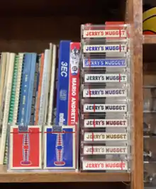 Jerry's Nugget playing cards were supposedly printed in the 1970s for the gaming tables, but never saw any action at the gambling table.[2] They were immediately sold in the gift store thereafter. They were made from top-of-the-line United States Playing Card Company card stock that is no longer available today, and is thinner than most modern playing cards. The chemical finish used for these cards is also not available today due to environmental reasons, meaning that they cannot be replicated.[3]