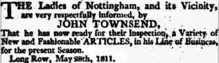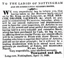 - "William Daft, Silk Mercer, Haberdasher, &c". Nottingham Review and General Advertiser for the Midland Counties. England. 27 March 1840. Retrieved 12 March 2018 – via British Newspaper Archive.
