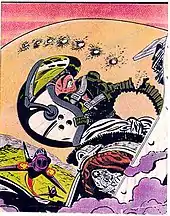 Lichtenstein usually simplified from his source material, but in Jet Pilot the gun sight is more detailed than in the source.[13] In Lichtenstein's image the line of enemy bullets follows a different path, thereby reducing the suspense caused in the source as the bullets ruptured the pilot's air hose.[13] The work also is related to Lichtenstein's theme of "machine and embodied vision" as exhibited in works such as Crak!, Okay Hot-Shot, Okay!, and Bratatat!.[14]