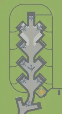 Jet blast deflectors began to appear at airports in the 1950s.[3][4] Airports in the 1960s used jet blast deflectors with a height of 6 to 8 feet (1.8 to 2.4 m), but airports in the 1990s needed deflectors that were twice as high,[5] and even up to 35 feet (11 m) high for jet airliners such as the McDonnell Douglas DC-10 and MD-11, which have engines mounted in the tail above the fuselage.[1] Airports often place their deflectors at the beginnings of runways, especially when roadways or structures are adjacent. Airports that are in dense urban areas often have deflectors between taxiways and airport borders. Jet blast deflectors usually direct exhaust gases upward.[6] However, a low-pressure zone can form behind the blast fence, causing ambient air and debris to be drawn upward with the jet exhaust, and hot, toxic gases to circulate behind the blast fence.[7] Jet blast deflectors have been designed to counteract this problem by using multiple panels and various angles, and by using slotted panel surfaces.[7]