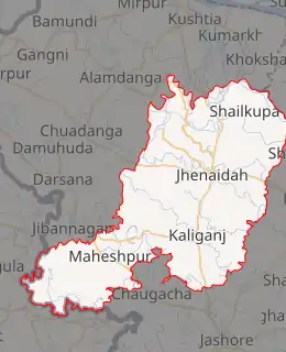 Jhenaidah District (Bengali: ঝিনাইদহ) is a district in southwestern Bangladesh. It is a part of the Khulna Division. It has an area of 1,964.77 km2 (758.60 sq mi).[2] It is bordered by Kushtia District to the north, Jessore District and West Bengal, India to the south, Rajbari District and Magura District to the east, and Chuadanga District and West Bengal, India to the west. The largest city and headquarter of this district is Jhenaidah.[3] At the beginning of the British rule Jhenaidah was a police outpost and was turned into a thana in 1793. The Jhenaidah Sub division was established in 1862 and was turned into a district in 1984.[4]