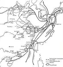![]() Map of early wokou raids (violet) and later Jiajing wokou raids (blue), with sea routes from Japan | |||||||