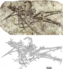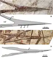 Jidapterus is based on holotype CAD-01, a nearly complete skeleton with partial skull. The skull is toothless and relatively long, with a straight and very pointed beak, and a large hole where the antorbital fenestra is joined with the nostrils. The eye sockets are small, and there is no crest along the lower jaw as seen in ornithocheiroids, although a short projection was present at the back of the skull. The wingspan of this individual was estimated to be 1.7 m (5.6 ft).[1]