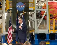 In March 2019, Mike Pence pushed NASA to land humans on the Moon in 2024 instead of the initially planned 2028.[56] Bridenstine stated that for it to happen, the Space Launch System would need to be accelerated, along with various other aspects such as the LOP-G, an orbiting space station around the Moon. Bridenstine also considered commercial Heavy-Lift rockets such as the Delta IV Heavy or Falcon Heavy. The idea was scrapped due to the logistical issue of docking an Orion and a European Service Module and the aerodynamics of using a Falcon Heavy.[57]