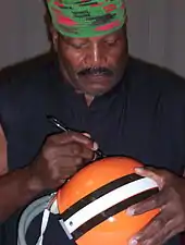 In 1983, 17 years after retiring from professional football, Brown mused about coming out of retirement to play for the Los Angeles Raiders when it appeared that Pittsburgh Steelers running back Franco Harris would break Brown's all-time rushing record.[35] Brown disliked Harris' style of running, criticizing the Steelers' running back's tendency to run out of bounds, a marked contrast to Brown's approach of fighting for every yard and taking on the approaching tackler. Eventually, Walter Payton of the Chicago Bears broke the record on October 7, 1984, with Brown having ended thoughts of a comeback. Harris himself, who retired after the 1984 season after playing eight games with the Seattle Seahawks, fell short of Brown's mark. Following Harris's last season, in that January, a challenge between Brown and Harris in a 40-yard dash was nationally televised. Brown, at 48 years old, was certain he could beat Harris, though Harris was only 34 years old and just ending his elite career. Harris clocked in at 5.16 seconds, and Brown in at 5.72 seconds, pulling up in later portion of race clutching his hamstring.[36]