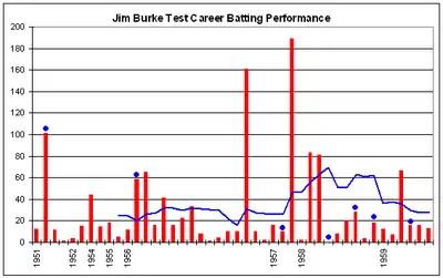 Australia required 147 on the final day to win, and Burke gave a display similar to Bailey, taking 250 minutes to score 28 not out and anchoring the hosts to an eight-wicket win, scoring less than 20% of the runs added while he was at the crease.[2][4] Between Tests, Burke scored 53 and 77 in New South Wales' 162-run win over Victoria.[4] Burke then suffered a month of low scores in a run of four matches against the Englishmen. He made 3 and 18 not out in an eight-wicket win in the Second Test in Melbourne, and was then dismissed for 12 and 7 in the drawn Third Test by his old nemesis Laker.[4] In the second innings of the Test, Burke took 2/26 including the wicket of English captain Peter May for 92,[4][6] and he was frequently accused by the touring journalists of throwing.