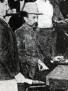 James Brown Miller (October 25, 1861 – April 19, 1909), also known as "Killin' Jim", "Killer Miller" and "Deacon Jim", was an American outlaw and professional killer of the American Old West, said to have killed 12 people during gunfights.[1] Miller was referred to by some by the alias "Deacon Jim" because he regularly attended the Methodist Church, and he did not smoke or drink. He was lynched in Ada, Oklahoma, in 1909 along with three other men, by a mob of residents angry that he had assassinated a former deputy U.S. marshal.
