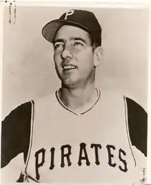 Two spots in the starting rotation were available by the time the Pirates started their 1960 season. At the beginning of spring training, Umbricht competed against fellow rookies Bennie Daniels and Joe Gibbon for a place.[9] The Pirates began strongly in spring training, winning 11 in a row at one point.[10] In a game against the Detroit Tigers, Umbricht combined with Daniels to throw a no-hitter.[10] Manager Danny Murtaugh was impressed with Umbricht's pitching and expected him to become the Pirates' fifth starter (a combination of spot starter and reliever) by opening day. He won the spot and in his first start of the season against the Reds on April 17, he gave up six earned runs in 5.1 innings, getting charged with the 11–3 loss.[11] In his next start against the Philadelphia Phillies on April 21, Umbricht had poor control, giving up three runs and walking five batters in 2.1 innings.[12] He made a last-minute start against Los Angeles Dodgers pitcher Don Drysdale on May 25, after Pirates starting pitcher Bob Friend had a sore throat and could not play.[13] Umbricht pitched five innings, striking out five batters, but gave up two critical second-inning home runs to Frank Howard and John Roseboro and was charged with the loss.[14] After an off-day and a game postponed because of rain, the Pirates faced the Phillies at home on May 28.[15] After the game went to extra innings, Umbricht pitched the 13th inning. The Pirates won in the later half of the inning, earning Umbricht his first career win.[7][16]