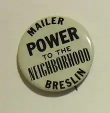 In 1969, Breslin ran for president of the New York City Council in tandem with Norman Mailer, who was seeking election as mayor, on the unsuccessful independent 51st State ticket advocating secession of the city from the rest of the state. A memorable quote of his from the experience: "I am mortified to have taken part in a process that required bars to be closed."[18] The ticket was referred to as "Vote the Rascals In".[19][20]
