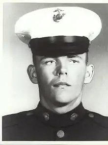 He completed recruit training with the 2nd Recruit Training Battalion, Recruit Training Regiment, Marine Corps Recruit Depot San Diego, California on March 14, 1968. Transferred to Marine Corps Base Camp Pendleton, California, he underwent individual combat training with Company L, 2nd Battalion, 2nd Infantry Training Regiment, followed by basic infantry training which he completed in May 1968.[1]