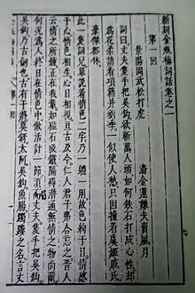 Jin Ping Mei (Chinese: 金瓶梅 chin-PING-may)—translated into English as The Plum in the Golden Vase or The Golden Lotus—is a Chinese novel of manners composed in vernacular Chinese during the latter half of the sixteenth century[1][2] during the late Ming dynasty (1368–1644). It was published under the pseudonym Lanling Xiaoxiao Sheng (蘭陵笑笑生), "The Scoffing Scholar of Lanling,"[3] but the only clue to the actual identity is that the author hailed from Lanling County in present-day Shandong.[4] The novel circulated in manuscript as early as 1596, and may have undergone revision up to its first printed edition in 1610. The most widely read recension, edited and published with commentaries by Zhang Zhupo in 1695, deleted or rewrote passages important in understanding the author's intentions.[5]