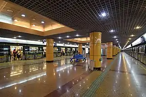 Jing'an Temple (simplified Chinese: 静安寺; traditional Chinese: 靜安寺; pinyin: Jìng'ān Sì) is the name of an interchange station between Lines 2 and 7 of the Shanghai Metro. This station is located in Jing'an District, below the historic Jing'an Temple and the Jiu Guang shopping mall. It is part of the initial section of Line 2 that opened from Zhongshan Park to Longyang Road that opened on 20 September 1999;[1][2][3] the interchange with line 7 opened on 5 December 2009 as part of that line's initial section between Shanghai University and Huamu Road.[4][5]