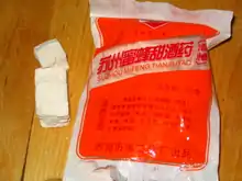 Jiuniang (simplified Chinese: 酒酿; traditional Chinese: 酒釀, also called láozāo (醪糟), jiāngmǐjiǔ (江米酒), or tiánbáijiǔ (甜白酒) in Yunnan) is a sweet, soup- or pudding-like dish in Chinese cuisine. It also known as sweet wine or sweet rice wine.[1] It consists of a mixture of partially digested rice grains floating in a sweet saccharified liquid, with small amounts of alcohol (1.5–2%) and lactic acid (0.5%). It is made by fermenting glutinous rice with a starter called Jiuqu (酒麴) containing Rhizopus oryzae or Aspergillus oryzae and often yeast and bacteria.