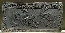 The Yongcheng Jixian Lu (墉城集仙錄[lower-alpha 1]), written by the Daoist master Du Guangting (850–933), contains a biographical account of Jiutian Xuannü.[8][9] It mentions that Jiutian Xuannü is the teacher of Huangdi and the disciple of Xi Wangmu.[8] The work relates a story about the goddess appearing before Huangdi during a time when the latter was in conflict with Chiyou.[8] Chiyou had caused a great mist, which was so impenetrable that it obscured day and night.[8] Huangdi would dwell in the mist for several days.[8] Jiutian Xuannü rode a cinnabar phoenix, holding phosphors and clouds as reins, into the great mist.[8] She wore variegated kingfisher-feather garments of nine colors.[8] Huangdi greeted her and received her command.[8] Jiutian Xuannü said: "I base myself on the teachings of the Grand Supreme. If you have any doubts, you may question me."[8] Huangdi responded: "[Chiyou] is cruelly crossing us. His poison is harming all the black-haired people. The four seas are sobbing. No one can protect his own nature or life. I want the art of winning a myriad victories in a myriad battles. Can I cut the harm facing my people?"[8] Thereupon the goddess bestowed various objects and artifacts.[8] The following is a few of the listed items:[lower-alpha 2]