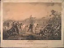 From 1868 he made several reconnaissances to help in the Siege of Humaitá, at the same time he took over the fortress's Establishment which was defended by fifteen cannons and supported by two ships with artillery, in addition to two ditches and mouths. Under heavy losses, he was wounded and had his horse killed, had his cavalry troops dismounted and attacked the fortress until he took it. Neves then participated in the Battle of Avaí. He commanded the troops that attacked Lomas Valentinas from the left, managing to take them inside the fortified position, but in the middle of the position, a bullet came to produce a serious wound in his foot.[3] Taken to Asunción, he was taken to the palace taken from Solano López. In the delirium of the fever that devoured him, under that fiery climate, legend has it that the brave general, as if in that tragic moment a Spartan soul had animated him, thought that he was still ahead of his squadrons and, throwing down the covers, waved: " Comrades!... one more load!"[1][2] José Joaquim de Andrade Neves died in the palace on January 6, 1869.[2]