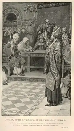 Jocelin did not, in the end, submit either to the Archbishop of York or even the Archbishop of Canterbury and managed to obtain a Papal Bull which declared the see of Glasgow to be a "special daughter" of the Roman Patriarchate.[24] Jocelin, moreover, does not seem to have been interested in the independence of the other "Scottish" sees, but merely to maintain his own episcopal independence, i.e. that of the bishopric of Glasgow. On 10 August 1175, along with many other Scottish-based magnates and prelates, Jocelin was at Henry's court giving his obedience to the king as stipulated in the treaty. Jocelin again appeared at King Henry's court in January 1176. This time church matters were on the agenda. When the Archbishop of York confronted Jocelin over the subordination of the bishopric of Glasgow to the archbishopric of York, Jocelin refused to acknowledge this part of the treaty, and presented him with the Papal Bull declaring Glasgow to be a "special daughter".[25]