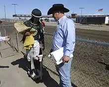 Jockeys usually start out when they are young, riding work in the morning for trainers, and entering the riding profession as apprentice jockeys. It is normally necessary for an apprentice jockey to ride a minimum of about 20 barrier trials successfully before being permitted to ride in races. An apprentice jockey is known as a "bug boy" because the asterisk that follows the name in the program looks like a bug.[4] All jockeys must be licensed and usually are not permitted to bet on a race. An apprentice jockey has a master, who is a horse trainer, and the apprentice is also allowed to "claim" weight off the horse's back: in handicapped races, more experienced riders will have their horses given an extra amount of weight to carry, whereas a jockey in their apprenticeship will have less weight on their horse, giving trainers an incentive to hire these less-experienced jockeys. This weight allowance is adjusted according to the number of winners that the apprentice has ridden. After a four-year indentured apprenticeship, the apprentice becomes a senior jockey[5] and usually develops relationships with trainers and individual horses. Sometimes senior jockeys are paid a retainer by an owner which gives the owner the right to insist the jockey ride their horses in races.