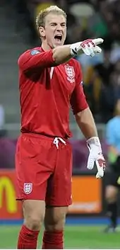 Hart did not feature in the World Cup but started England's next match, a friendly against Hungary, to earn his fourth cap.[141] He conceded his first England goal in dubious circumstances when the ball appeared not to have crossed the line from a deflection from Phil Jagielka, and made a vital late save from Zoltán Gera as England won 2–1.[146] Hart was given his first competitive cap in a UEFA Euro 2012 qualifier, a 4–0 win against Bulgaria at Wembley Stadium; he made three crucial saves, one of which he palmed away to begin the counterattack that led to an England goal.[147] However, he had a poor game in another Euro 2012 qualifier against Switzerland on 4 June 2011, inexplicably letting in two Tranquillo Barnetta free-kicks.[148] For the second Switzerland goal Hart was caught out by a relatively straightforward shot which unexpectedly beat him at his near-post from a tight angle.[68] Hart won another two caps November 2011 in friendlies against world champions Spain and Sweden, in each case keeping a clean sheet in a 1–0 England victory.[149]