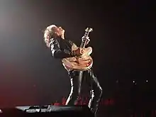 Perry has a collection of about 600 guitars.[86] He prefers Gibson guitars,[88] particularly the Les Paul, with a few models even recreated by the manufacturer as part of their Signature series. One of those, a 1959 Gibson Les Paul,[89] had to be sold by Perry during his 1982 divorce. Later Perry had his guitar tech and equipment managers search for this guitar. One day someone brought him a guitar magazine and in the middle of the centerfold was Slash with the Les Paul in his hand. Perry immediately called Slash and bugged him for years, offering to pay more than the guitar's worth which had nearly tripled since Joe sold it. Eventually he gave up as it was straining the pair's friendship. Many years later at Joe's 50th birthday party, Slash finally gave him the guitar as a gift.[90] He also owns various Gibson ES guitars (one of which features a painting of his wife Billie), and Gibson Firebirds.[88]
