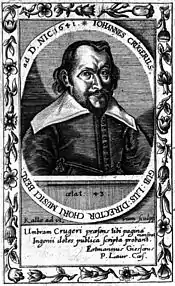 In 1628, he married the widow of a city councilman. During the Thirty Years' War, Crüger and his family endured many hardships including hunger.[3] He fell ill with plague, and almost died of that disease, losing five children and his wife in 1636. In 1637, having recovered from the disease, he got married a second time, to the 17-year-old daughter of an innkeeper, with whom he had fourteen children, most of whom died at a young age.[3] One of his daughters married the court painter Michael Conrad Hirt, who made a portrait of Crüger in 1663.[1] Crüger died in Berlin.