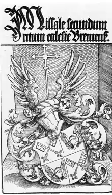 Rode's coat of arms is recorded in Erfurt's enrolment list.[3] It is also presented in the upper right and lower left quarters as given on the front page of the Missale secundum ritum ecclesie Bremense, which has been edited on Rode's instigation under his supervision, as shown on the right. Rode's coat of arms shows in an azure (blue) field two wings in or (gold) flanking a modest Jousting helmet in or turned dexter (shield bearer's right, but viewer's left).[3] The crest consists of two buffalo horns in argent (silver) banded in azure flanking an argent helmet.[3] The supporter, not shown here, is an ape-like haired wild man with face, hands and feet in gules (red), referring to the family name Rode, which means in Low Saxon the red (one), (Latinised: Rufus).[3] On the front page of the Missale secundum ritum ecclesie Bremense the Rode family coat of arms combines in a quartering with the coat of arms of the Prince-Archbishopric of Bremen.