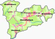 In the first, voluntary phase of municipal reform, the formerly self-administering communities of Breunsberg, Johannesberg, Oberafferbach and Rückersbach merged into a new entity with the name Johannesberg. In 1976, the communities of Johannesberg and Glattbach together formed the Verwaltungsgemeinschaft (municipal association) of Rauenthal. In accordance with the Lower Franconian government's decision, the outlying centre of Rauenthal – formerly an exclave – was split from the community of Johannesberg and merged into the community of Glattbach instead. After the voluntary phase of municipal reform ended, the community of Steinbach was forcibly incorporated into Johannesberg in 1978.