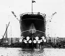 Clydebank also became Cunard Line's preferred shipbuilder, building its flagship liners RMS Lusitania and RMS Aquitania. Prior to construction commencing on the Lusitania in 1904 the shipyard was reorganized to accommodate her so that she could be launched diagonally across the widest available part of the river Clyde where it met a tributary, the ordinary width of the river being only 610 feet (190 m) compared to the 786-foot (240 m) longship. The new slipway took up the space of two existing ones and was built on reinforcing piles driven deeply into the ground to ensure it could take the temporary concentrated weight of the whole ship as it slid into the water. In addition, the company spent £8,000 to dredge the Clyde, £6,500 on a new gas plant, £6,500 on a new electrical plant, £18,000 to extend the dock and £19,000 for a new crane capable of lifting 150 tons, as well as £20,000 on additional machinery and equipment.[9]