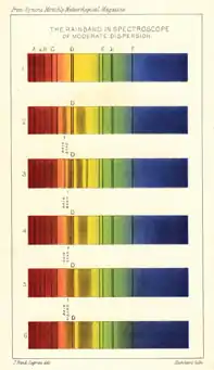 While the first edition of 1878 contained only black and white images, the second edition of How to Work With the Spectroscope included one notable colour illustration (pictured). It was of the rainband spectrum by lawyer and scientist John Rand Capron.[17] It first appeared as a black and while image in Symons's Monthly Meteorological Magazine. However, the second, 1882 edition of John Browning's handbook reproduced the plate in colour.[17] It demonstrated Joseph von Fraunhofer's solar lines A-F, with the rainband adjacent to the D lines.[18] In the late 19th century, scientists were interested in the rainband for its potential in the detection of atmospheric water vapour and, therefore, the prediction of rain. Evaluation of the rainband represented the first attempt to use spectroscopy in the field of meteorology.[18] Scottish astronomer Charles Piazzi Smyth supported the contention that water vapour bands could be used to predict rainfall in the 22 July 1875 issue of Nature.[18] While the topic of the rainband and its use in meteorology was controversial, John Browning (and his competitors) manufactured pocket spectroscopes designed to show the rainband and marketed them as meteorological tools.[17][18]