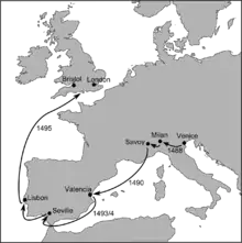 Cabot's travels around Europe, 1488–95, following his escape from Venice