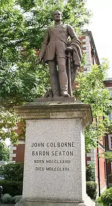 In November 1866 a bronze statue of Colborne, sculpted by George Adams and financed by public donations, was erected at Mount Wise at Devonport: it was moved to Seaton Barracks in Crownhill in the early 1960s and then to Peninsula Barracks in Winchester in the 1990s.[32] A second statue of Colborne also sculpted by George Adams was erected at Upper Canada College.[33]
