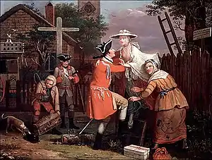 John Goldar engraved after him The Sacrifice, The Refusal, The Recruiting Sergeant, exhibited in 1767, The Female Bruisers, exhibited in 1768, and also engraved in mezzotint by Butler Clowes, The Spirit is Willing, but the Flesh is Weak, The Country Choristers, The Unlucky Attempt, The Discovery, The Mutual Embrace, and Modern Love, in four scenes, Courtship, The Elopement, The Honeymoon, Discordant Matrimony, painted in 1765, and published in 1782, after his death.[2]