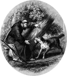 John Howie in the Scots Worthies tells about the dog: "During his travels abroad he was frequently delivered out of very great dangers, by the kind interposition of a gracious Providence: an instance of which we have while he was in Italy. Being obliged to flee out of that country, on account of his regard for the Reformation, in order to avoid being apprehended, he was obliged to lurk in obscure places in the day-time, and travel over night. By this means any little money he had was soon exhausted, and being in the extremity of want, a dog brought a purse to him with some gold in it, by which he was supported until he escaped the danger of being taken."[29] John Hamilton argued "...a black dog gave to him by the way a purse of gold. The colour of the dog may declare whether it was sent by a good spirit or not; for the Holy Spirit descended upon Christ in the likeness of a white dove."[27]