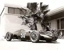 Following the achievements of the Dolphin he came to the attention of Mickey Thompson, who was well known for involvement in drag racing, land speed record attempts and motor racing. Thompson and his sponsors, Harvey Aluminium and Jim Kimberly (of Kimberly Clark), asked Crosthwaite to design a car to race in the 1962 Indianapolis 500. Unusually they used a stock V8 Buick engine and it was in the rear unlike the front-engined, race tuned, Offenhauser powered cars used by most competitors. It was the first stock engine to be raced at Indy since 1946 and was the beginning of the rear engine transformation at the Indianapolis 500. The car had 16-inch wheels instead of the usual 18"/20" seen at Indy and fully independent suspension. The only thing in common with the Dolphin was the NSU lower front suspension trunion. Thompson's crew led by Fritz Voigt were young, smart and hard working. Working 12-14-hour days, the car was designed and built in 120 days. Crosthwaite lived in a local motel and was rarely home. For the race, the engine (enlarged to 4.2-litre capacity, the maximum allowed by the regulations for "stock block" engines) had to be detuned because they were concerned it would not last the distance. Despite being more than 70 bhp down on the other cars Dan Gurney qualified eighth and was in ninth place until a leaking oil seal seized the gearbox and ended his race on lap 94. He was placed 20th out of 33. The team won the Mechanical Achievement Award for original design, construction and accomplishment.[25][26][27][28][29][30][31][32][33][34][35][36][37][38][39][40][41] [42][43][44]