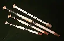 Chanter and drones of a set of smallpipes by John Dunn, currently in the Morpeth Chantry Bagpipe Museum