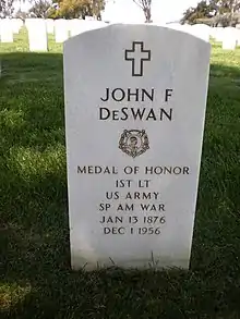 2. "War with Spain; De Swan, John F." Medal of Honor recipients, War With Spain. United States Army Center of Military History. August 3, 2009. Retrieved August 2, 2010.