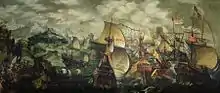 He embarked on a comprehensive reform of naval administration and managed to achieve an annual saving of nearly £4000 per annum, while at the same time raising naval pay.[13] He reformed the design of galleons so that they were longer, able to carry a larger number of guns and capable of sailing closer to the wind.[14] As a result of Hawkins' reforms, according to Garrett Mattingly, the Navy was a "fighting-fleet faster and more weatherly than any that had ever been seen on the ocean before".[14] He also increased the size of the Navy, so that by 1587 it consisted of 23 ships and 18 pinnaces.[13] The historian Conyers Read said of Hawkins' tenure as Treasurer of the Navy: "To him if to any single man belongs the chief credit for the first-rate fighting fleet which Elizabeth was able to launch against the Armada".[15]