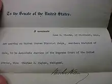 In June 1916, a vacancy arose on the Supreme Court when Associate Justice Charles Evans Hughes resigned to accept the Republican nomination for President. Wilson wanted to fill the seat by appointing his Attorney General, Thomas W. Gregory, but Gregory demurred and suggested Clarke instead.[7] After having Newton Baker (Wilson's Secretary of War and a close friend of Clarke's) speak with Clarke to confirm his opposition to trusts,[8] Wilson offered Clarke the nomination. Though Clarke was reluctant to abandon trial for appellate work, he felt he could not pass on such an honor and accepted. Wilson sent his name to the Senate on July 14, 1916, and Clarke was confirmed by the United States Senate unanimously ten days later.[9] He was sworn into office on October 9, 1916. [1]