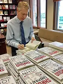In March 2017, Simon & Schuster (through its Howard imprint) published Heubusch's debut novel, The Shroud Conspiracy, a religious thriller concerning the turmoil after a forensic anthropologist discovers the Shroud of Turin - believed by many Christians to have been the burial cloth of Jesus Christ - is real.[47] Steve Forbes, writing in Forbes, called it "a spectacular thriller."[48] Publishers Weekly noted "Heubusch’s thought-provoking conceit" and "interesting premise," but criticized his "dense exposition and clunky characterization."[49] The book rose to rank as Amazon's #1 best-selling hardback in three categories.