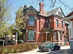 The John J. and Agnes Shea House is a historic building located in Council Bluffs, Iowa, United States. This is the only brick Queen Anne house in the city with a corner tower topped by a witch's cap.[2] The 2½-story structure features an asymmetrical plan, complex roofline, corbelled chimneys, gables, bays, and porches. It also contains beveled, rounded and stained glass windows. The house was built by local contractor George Monroe, with brick work done by the Wickham Brothers and carpentry work by J.H. Murphy. It was built for John Joseph Shea, a local attorney, his wife Agnes Mary Fenlon Shea, and their six children. They moved to Indian Territory, and after it became the state of Oklahoma, Shea became a judge. Local banker Timothy G. Turner acquired the house in 1900 before the Sheas left for Indian Territory. It was listed on the National Register of Historic Places in 1995.[1]